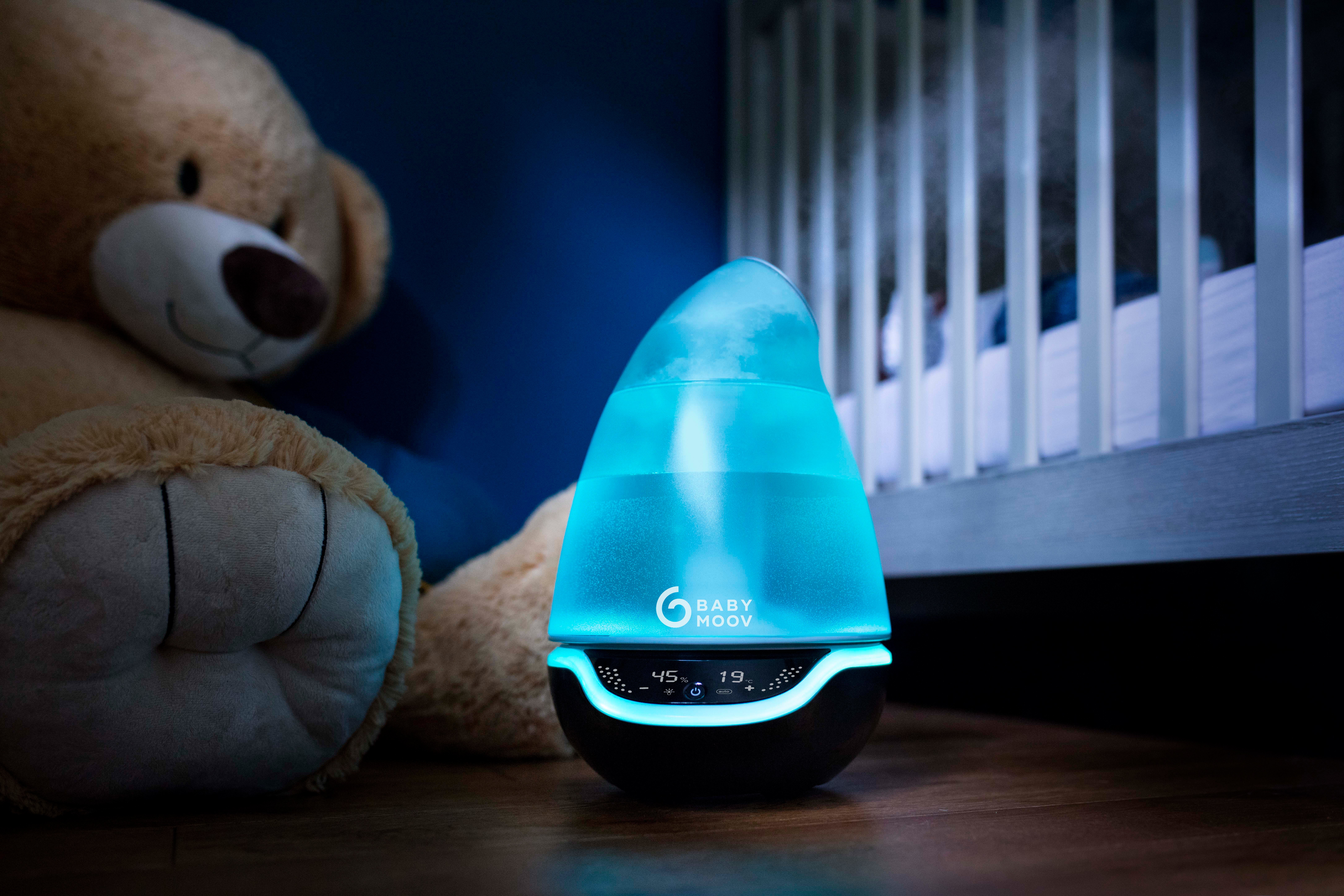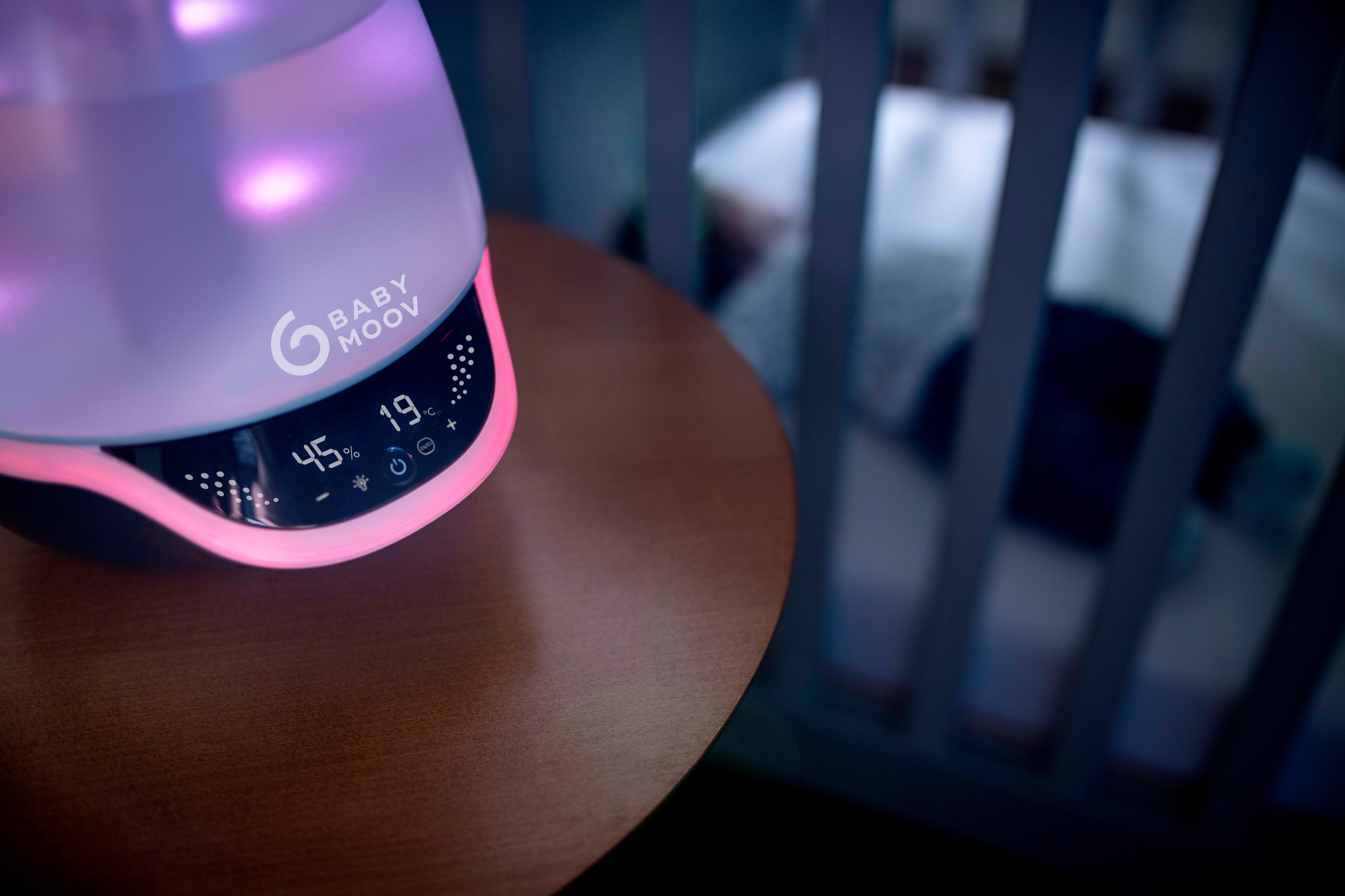 El humidificador ultrasónico Hygro+ te permite controlar la tasa de humedad y la temperatura de forma precisa, creando un entorno óptimo para el descanso infantil.