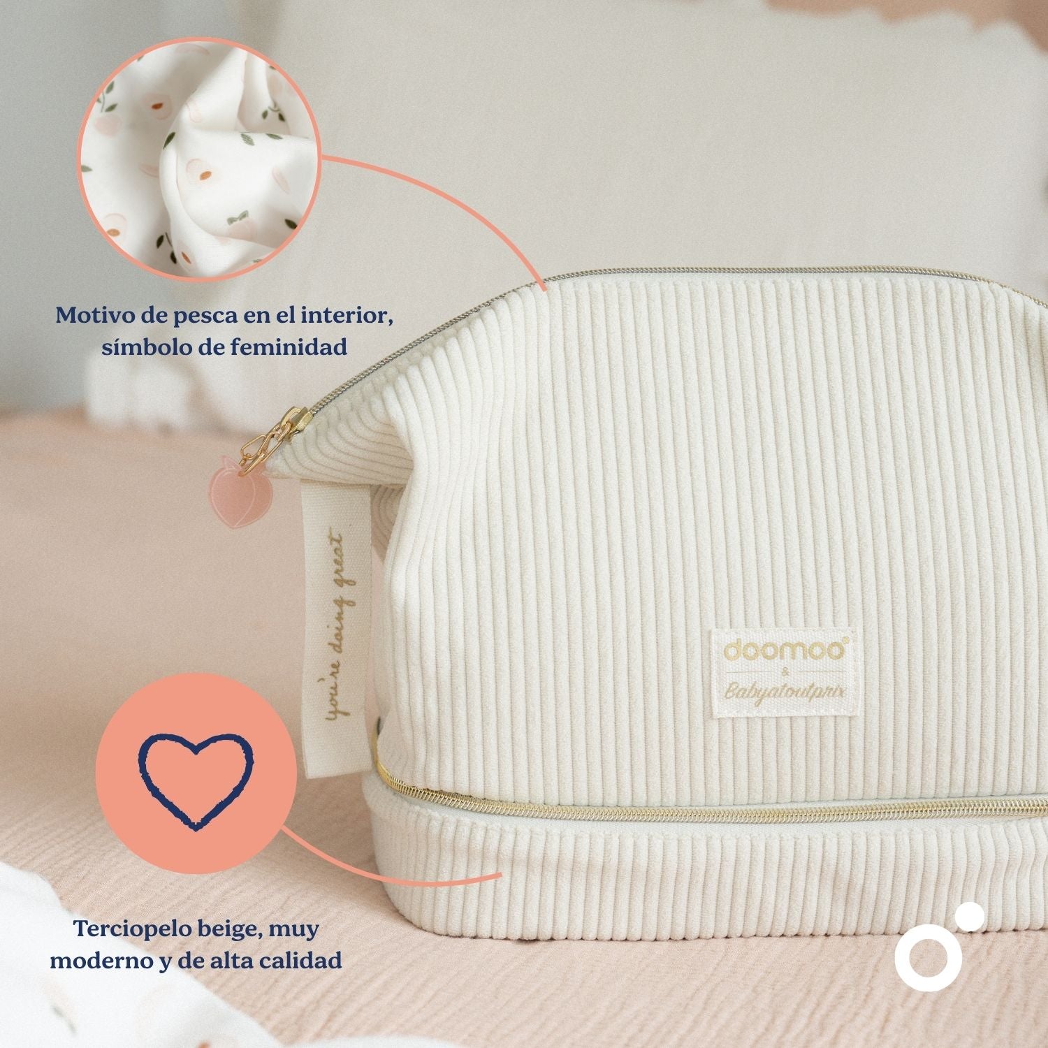 Con su terciopelo acanalado beige, detalles dorados y forro estampado, este neceser es tan práctico como elegante. Incluye un bolsillo aislado para mantener la higiene y otro interior para tus imprescindibles.