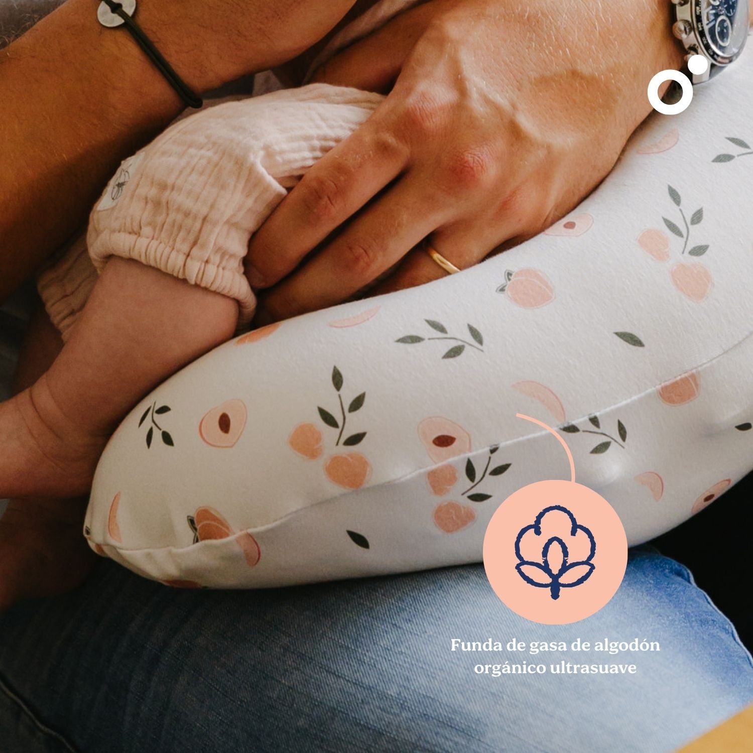 Materiales seguros y ecológicos: Malla de algodón orgánico certificada GOTS y microperlas hipoalergénicas de poliestireno expandido certificadas Oeko-TexOEKO-TEX®, libre de sustancias nocivas para la piel del bebé y la mamá.