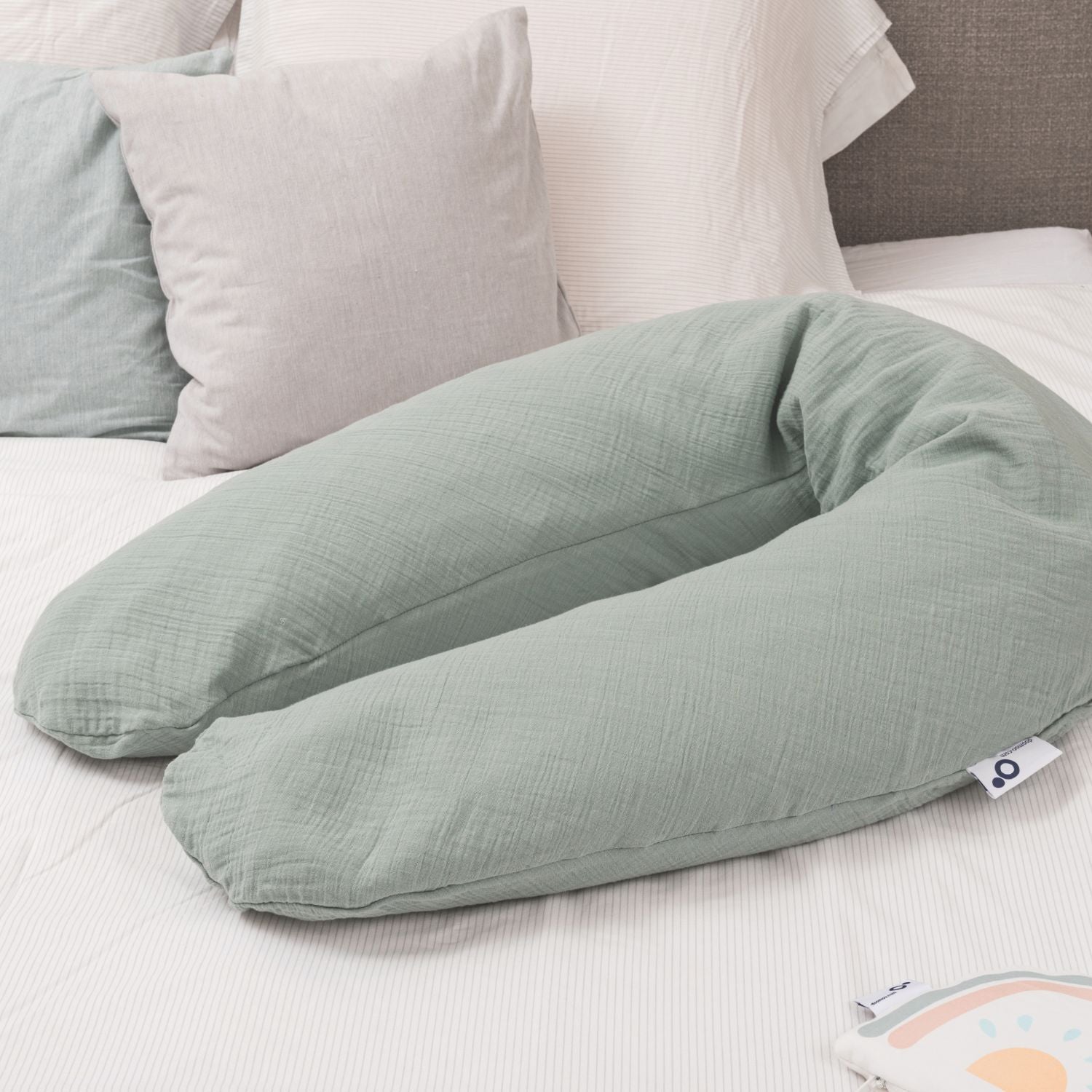 Este cojín de maternidad cuenta con una funda de gasa de algodón 100% orgánico, certificada GOTS que aporta estilo y calidez a tu hogar.