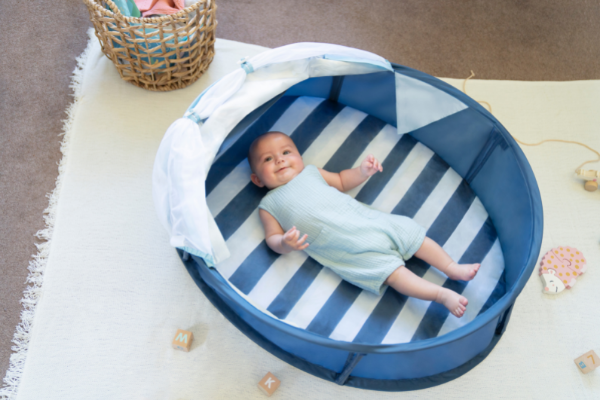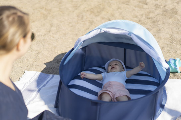 La Babyni es una innovadora zona de juego portátil con protección solar UPF 50+ que protege eficazmente a tu bebé del sol, el viento y la arena.